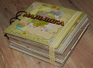 На бук пошла заготовка для альбома 15*15 на кольцах - 2 листа на обложку и 4 - на заголовки разделов. В альбомчик запихала все, что только было можно - фотоальбом, дневник беременности, дневник ребенка, достижения, история... Получился неслабый такой пухляш, который вынужденно получил на край резинку )) По этой же причине - прошит без люверсов...в самой толстой части - его высота 6 см, а мои самые большие кольца - 5,5 см...))